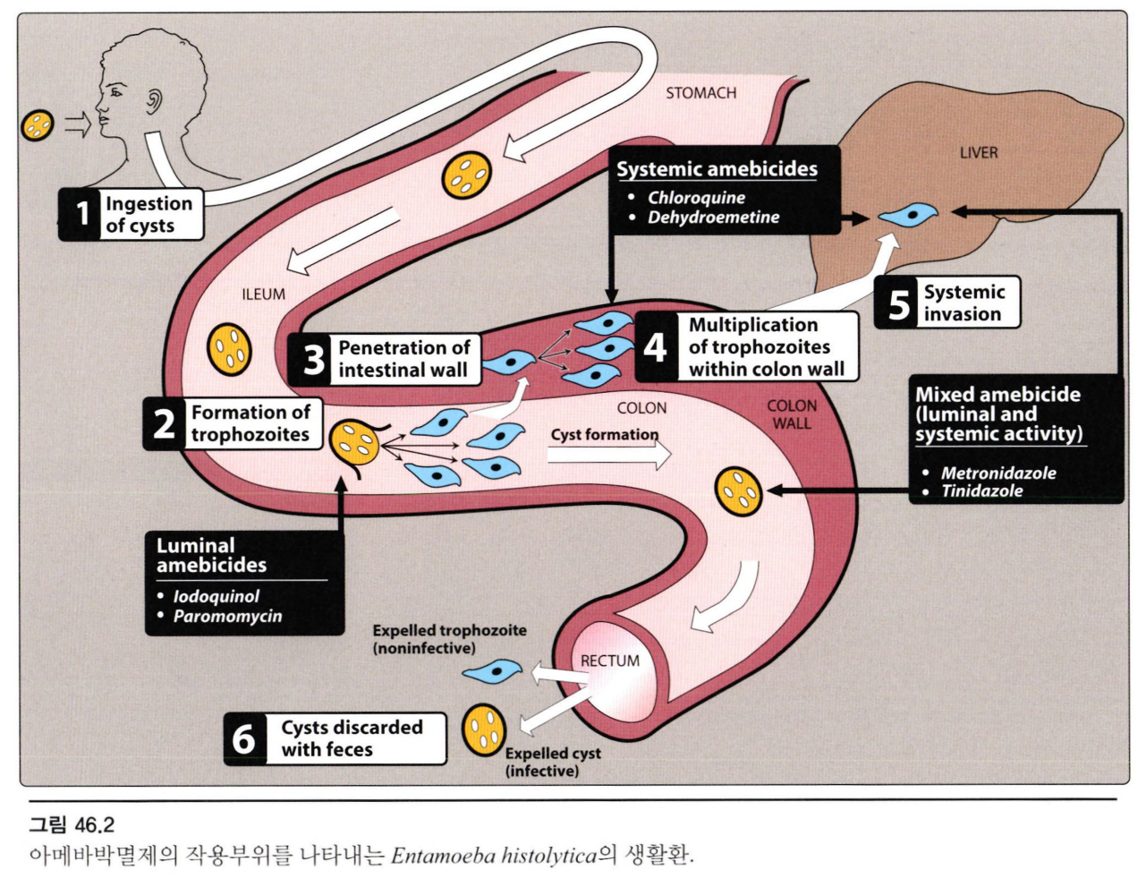 - E. histolytica의 생활환, 이에 따라 작용부위를 조절한다.