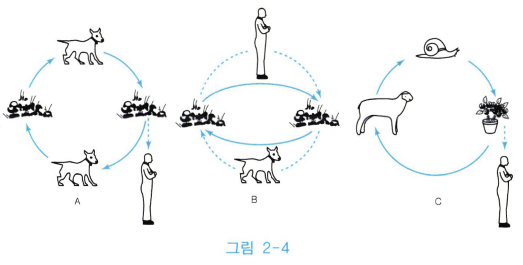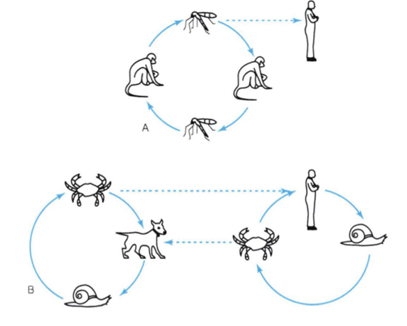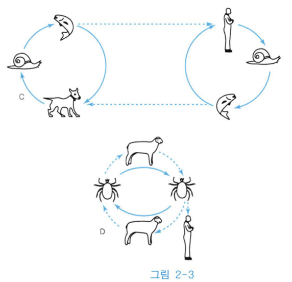 • B : 초식동물-육식동물의 전파. 그림(목양견과 양)은 포충증^[점선은 생활사에 필수가 아니라, 우연 감염됨을 의미]