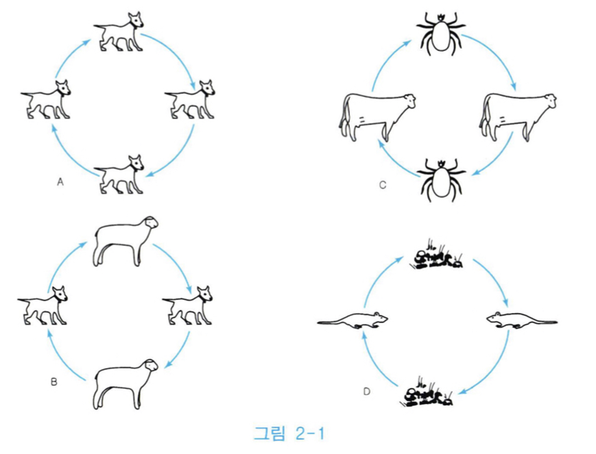 • 병원체의 생활사 → Directzoonoses, Cyclozoonoses, Metazoonoses, Saprozoonoses