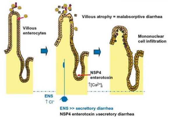 • 바이러스의 NSP4 단백질의 enterotoxin의 작용과 바이러스로 유도되는 신경전달물질로 인해 → 장 상피의 분비 pathway가 활성화 → 전해질을 장관 내로 분비, 설사 증상 심하게 유발 (“secretory diarrhea”)
