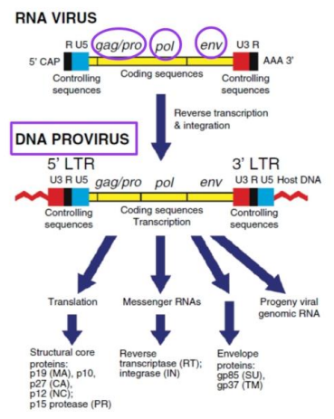 • 바이러스 구조 합성에 필요한 세 유전자는 genome에 끼어서 provirus의 형태로 존재