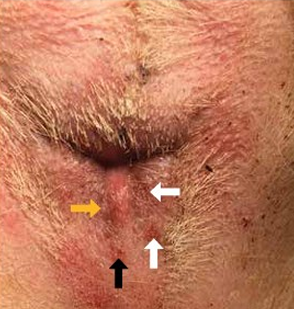• 항문 주변에 1개 이상의 구멍 + 그 주위로 궤양