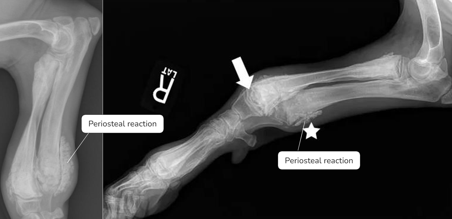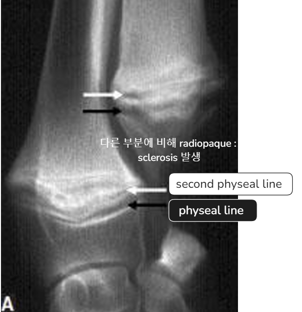 | - 아래쪽만 양옆으로 커지면서 flaring 양상을 보임. | Early sign - Metaphyseal soft tissue swelling | 비정상적인 periosteal reaction이 심하게 나타남, 성장판도 손상 받음 |