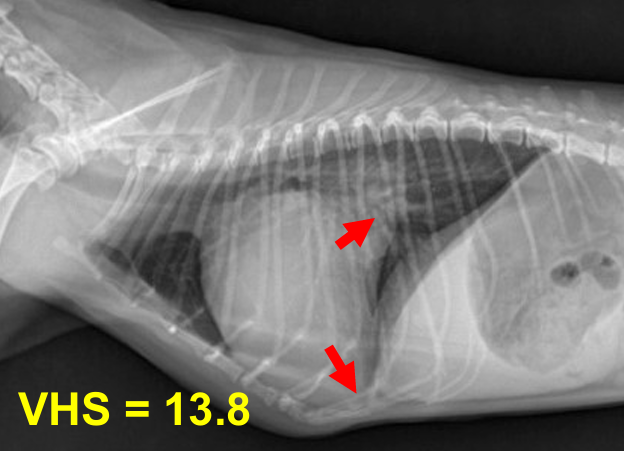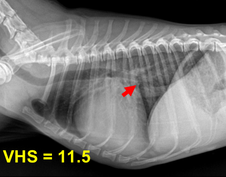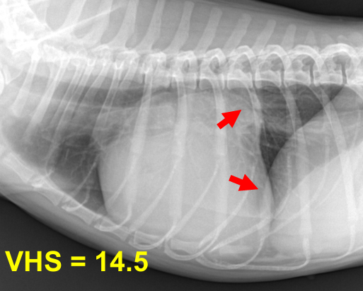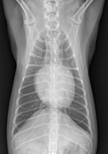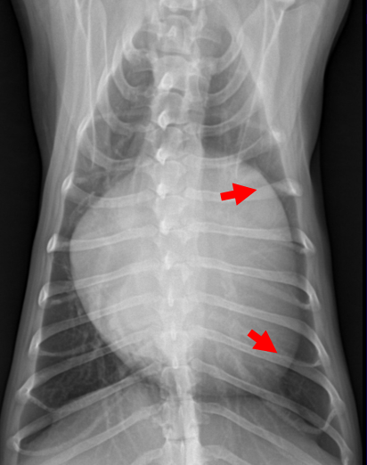 Left auricle 확장, cranial/caudal waist 소실, Globoid heart, Cardiomegaly