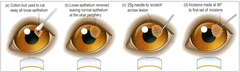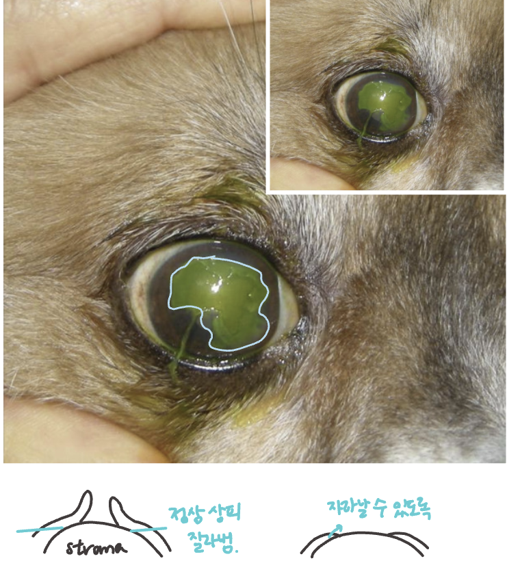 - 교수님은 궤양 바깥쪽으로 상피를 긁어내는 편. 상피는 어차피 잘 자라기 때문에, 정상 상피가 나올 때까지 파헤침. 움푹 파이게 되지만, 금방 낫는다.