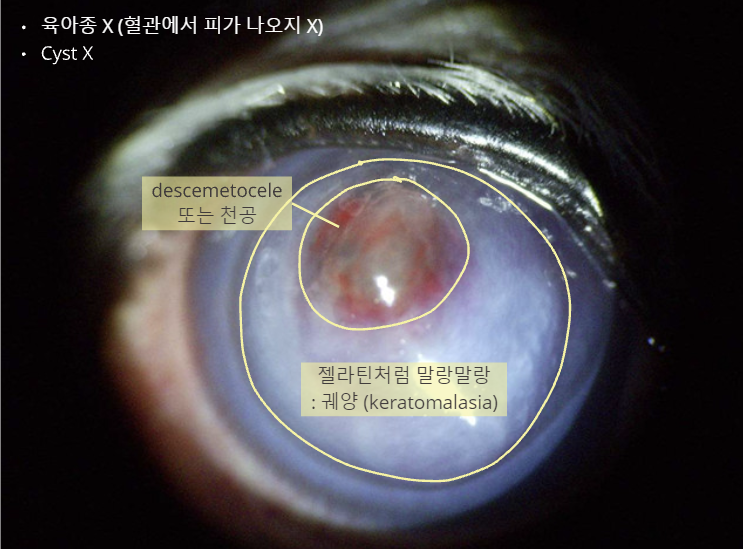 descemetocele이나 ? 안 보임, keratomalasia만 있음, stroma 충분히 있음