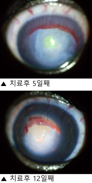 수술 : 결막을 각막에 이식하는 수술 (conjunctival graft; flap과는 다름) → 궤양 때문도 있지만, 각막 궤양에 혈관을 공급해주기 위해 시행하는 수술. (점막의 모세혈관을 이식)