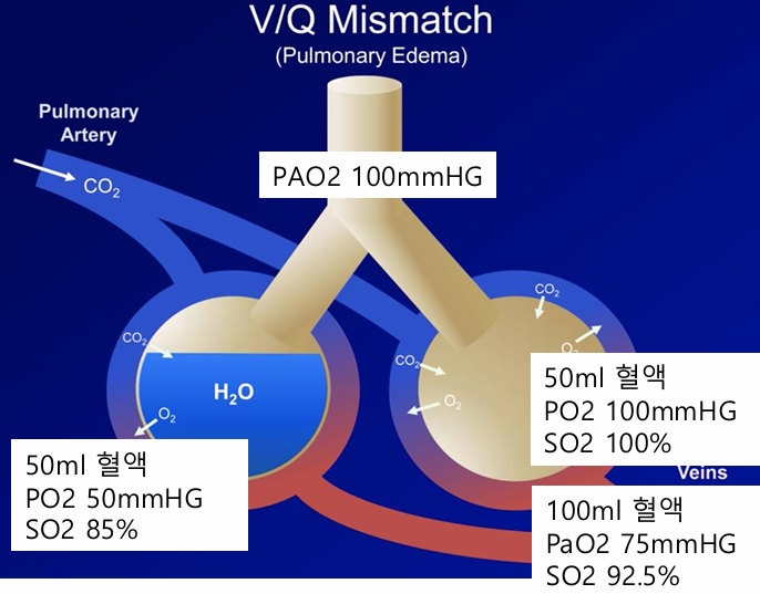 • V/Q mismatch (V=ventilation, 폐포 안에 공기가 채워지는 것 / Q=perfusion, 모세혈관의 관류)