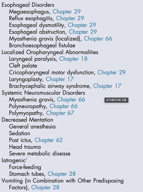 - 후두, 인두 쪽 신경 문제로 후두 덮개가 잘 작동하지 않을 때에도 나타날 수 있음.