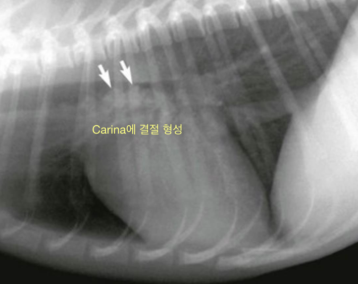 - 종양이 기관지를 압박하면서 기침, 호흡 부전, 객혈(폐출혈) 등