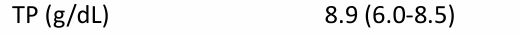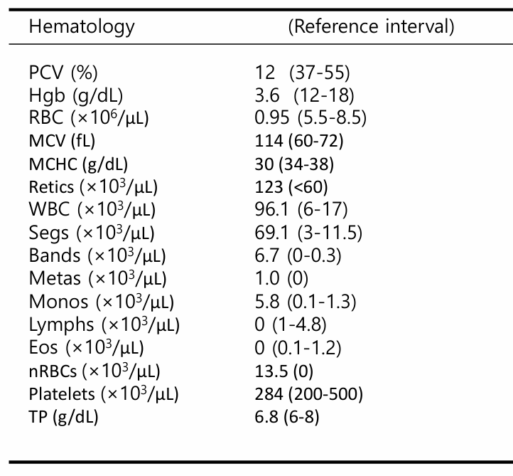 ![]() | - Total protein์ ์ฆ๊ฐ โ Blood loss anemia๋ Rule-out. hemolysis ์์ฌ. (์ง๋จ ๊ฒฐ๊ณผ ์ผ์ฆ์ฑ leukogram์ด๋, Ig ์ฆ๊ฐ์ ์ํ albumin&globulin ์ฆ๊ฐ์ ์ํฅ์ ๋ฐ์์ ์ ์๊ฒ ๋ค.) |