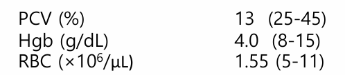 | Case #2 | 11y male cat lethargy, polydipsia, 1๋ฌ ์ PCV๋ 38% |