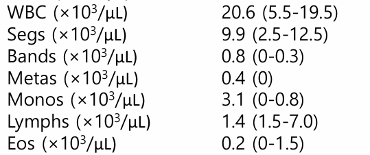 ![]() | - Leukocytosis - Neutrophil ์ ์ ๋ฒ์ - Band cell, Metamyelocyte ๊ด์ฐฐ : 1+, 2+ left shift. - Segmented Neutrophil์ด ๋ง์ โ Regenerative left shift - Monocytosis, Lymphopenia โ Stress leukogram์ ๋๋ฐํ ์ผ์ฆ์ฑ leukogram |