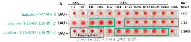 | (양성 = RBC membrane에 문제될 만큼 충분한 양의 항체 존재) | |
