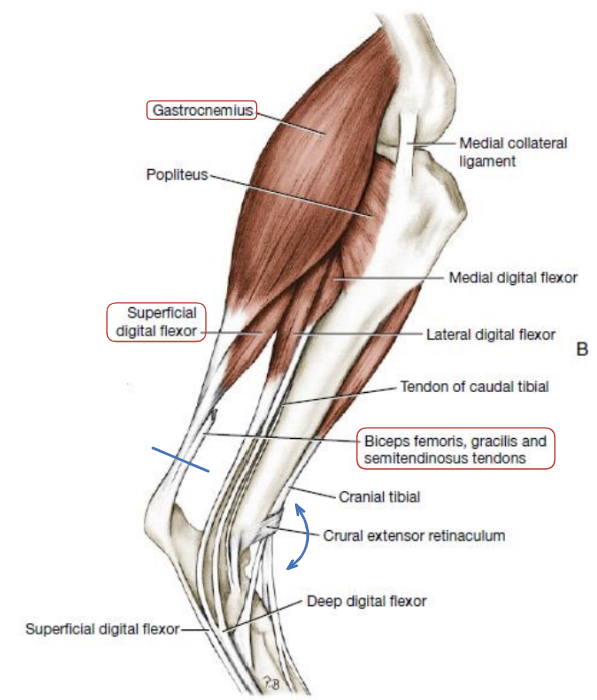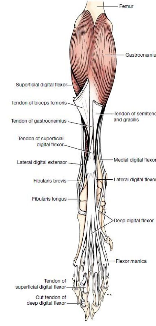 if) superficial digital m.의 힘줄에 영향 X → 발목뼈의 과굴곡, 발가락의 굴곡(flex)
