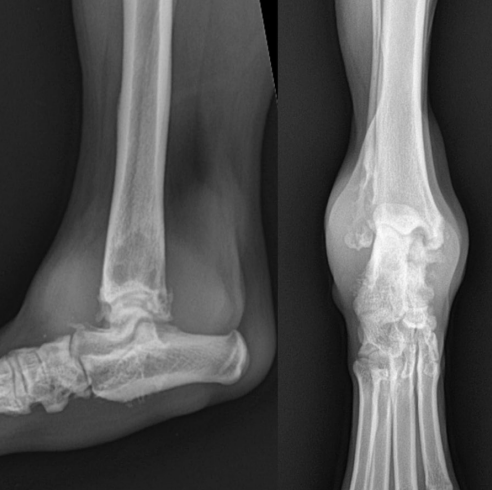 - distal joints보다 carpus, tarsus 위쪽 관절에서 더 흔함.