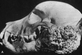 - 미성숙한 개에서 발생하는 증식성 뼈 질환. Occipital bones(뒤통수뼈), tympanici bullae(고실), mandibular rami(아래턱뼈)에 침범함.