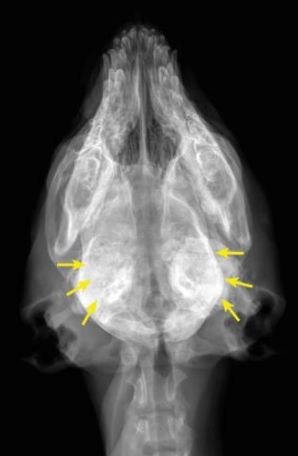 ![]() | - tympanic bullae가 안 보일 정도로 두꺼워져 있음. |