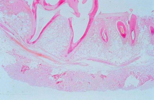 ![]() | - Lamellar bone의 파골 작용 → 흡수 - 뼈막에 새로 생긴 뼈 조직에 염증세포가 침윤됨. - 사람에서의 osteitis deformans(Paget’s disease) 유사. |