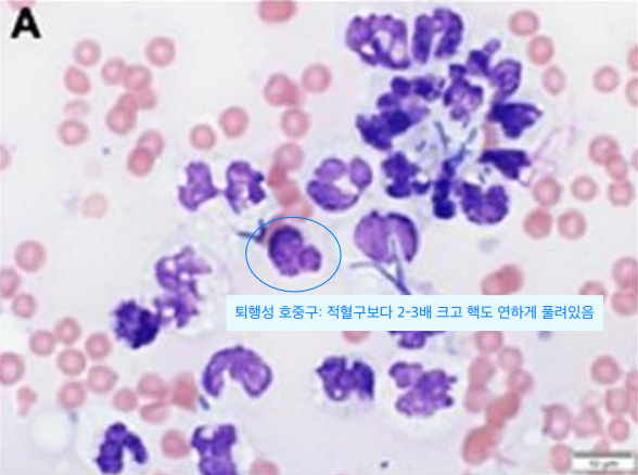 - 현미경으로 호중구성 염증 소견(퇴행성 호중구)이 관찰됨. (비특이적)