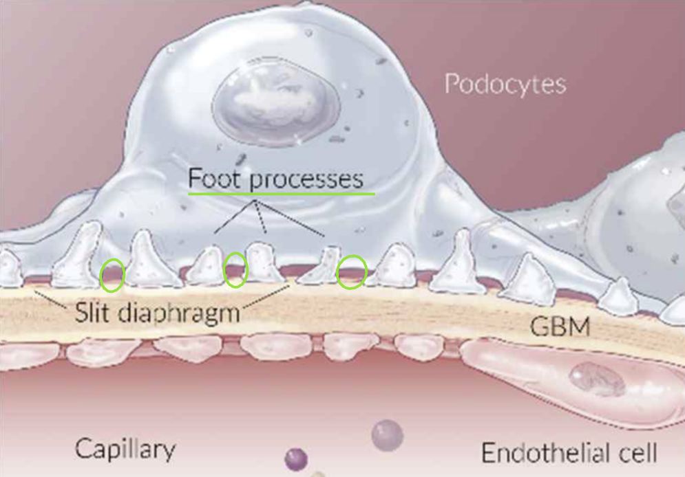 - 중간중간 pore가 생기는데, 이 pore의 크기가 혈액에서 소변으로 여과되는 크기를 결정한다.