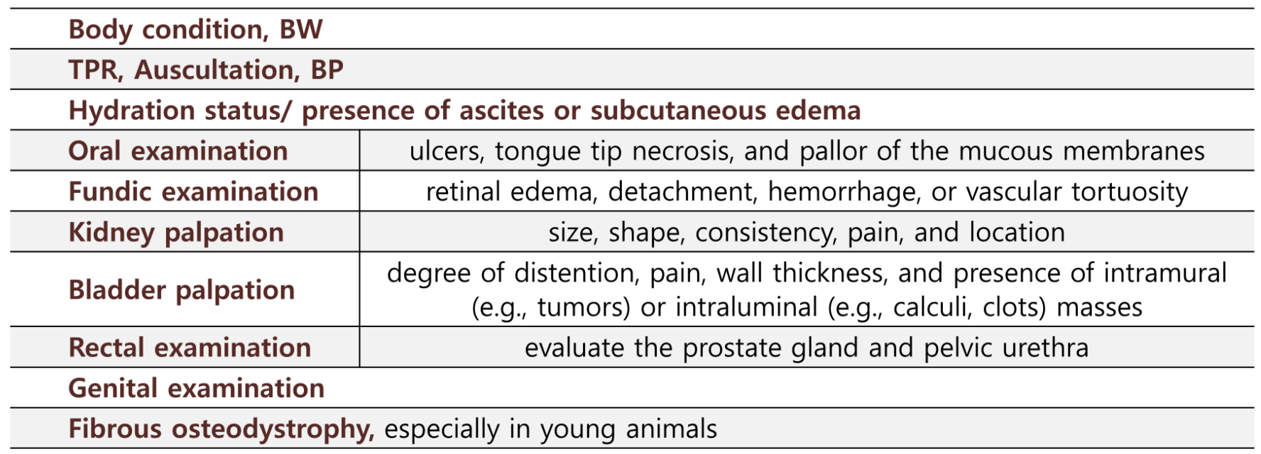 | 방광 촉진 | 팽창 정도, 통증, 벽 두께, 종괴 여부- 종양(tumor), 결석(calculi), clots |