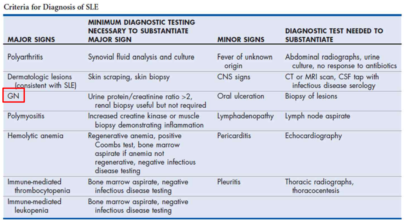 • 전신 발열, 다발성 관절염, 빈혈 등이 신염과 함께 관찰되는 경우, SLE 감별진단이 필요함.