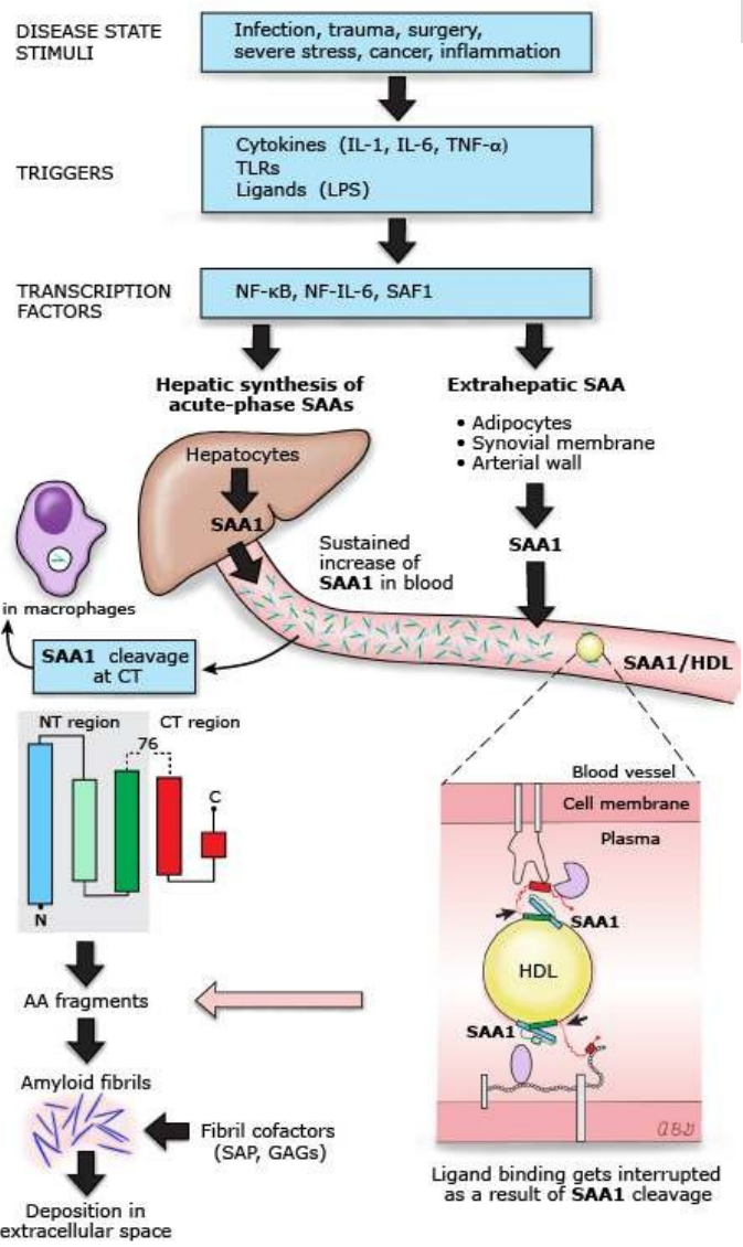• 감염, 심각한 염증 또는 면역 관련 상태, 종양 등의 자극에 의해 급성기 단백질인 SAA가 과도하게 형성되어 침착됨.