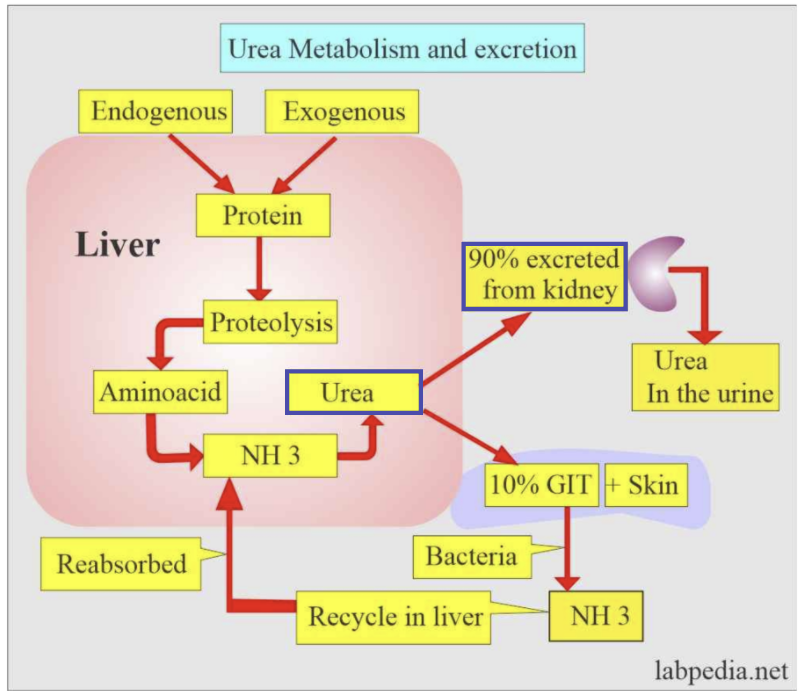 - urea의 배출은 glomerular filtration에 의해 일어나므로, BUN 농도는 GFR과 반비례 관계 (여과율이 감소하면 혈중 요소가 증가해 BUN 농도 높아짐)