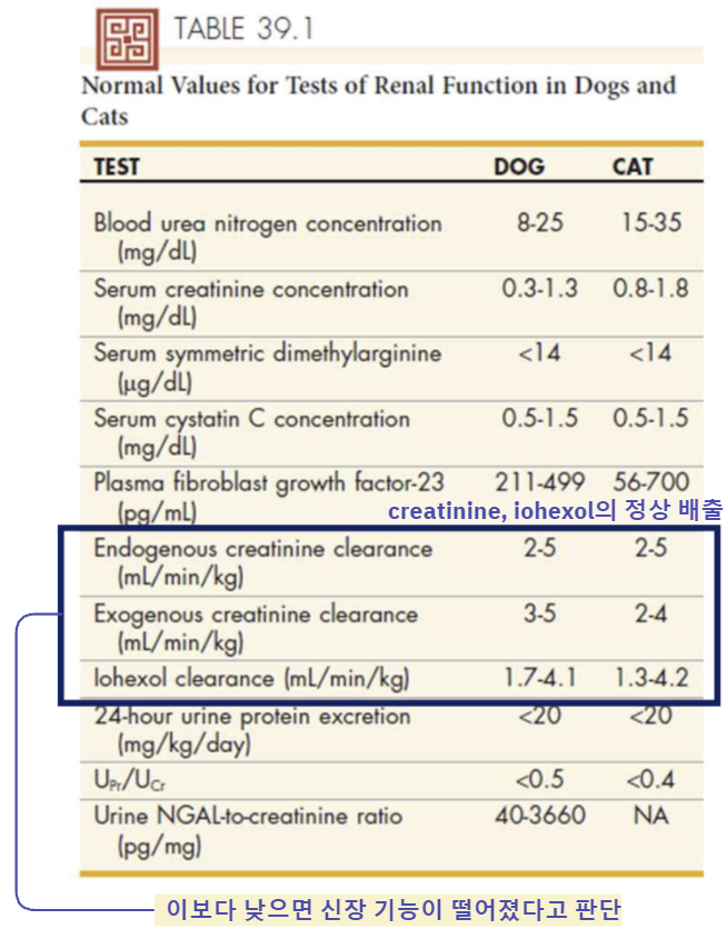 - 정상 GFR 범위 : 개는 3.5 내외, 고양이는 2.5~3.5, 대형견보다 소형견에서 높음.
