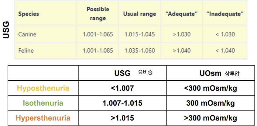 - Maximum reference range : 1.001-1.075 (개), 1.001-1.085 (고양이)