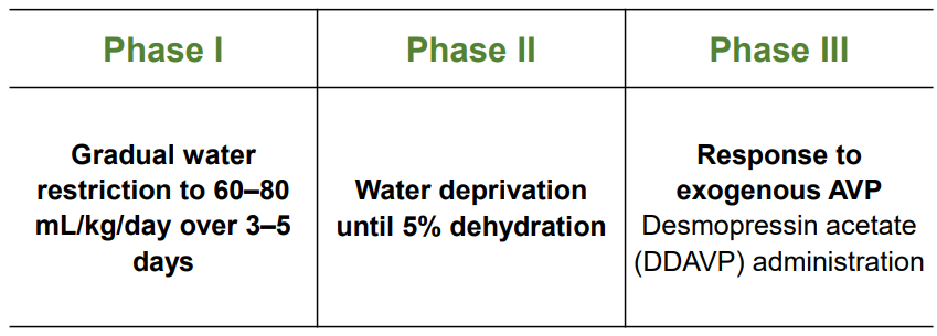 - 장점 : 비교적 정확. 호르몬 분비 자체 이상인지, 신장 농축 능력 저하인지 확인 가능.